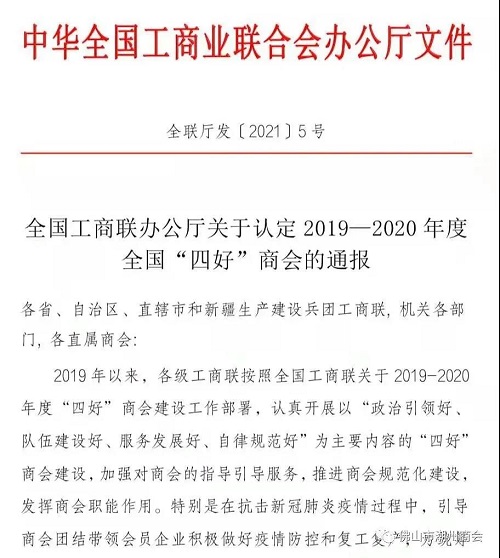 1月24日,全国工商联发布2019-2020年度全国“四好”商会名单,佛山市潮州商会荣膺全国工商联“四好”商会殊荣。