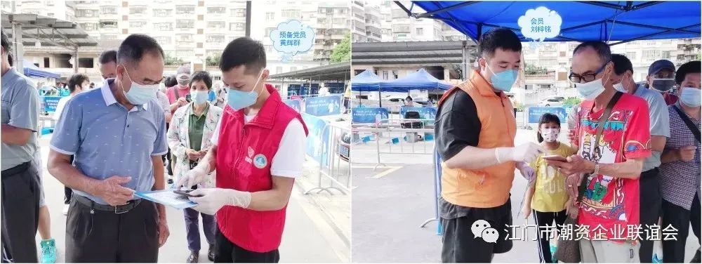 蓬江区长安里采样点、乐盈里广场采样点、定益广场采样点,江海区江南幼儿园采样点,都有我们商会成员甚至家属的身影。他们,或负责露天爆嗮区域工作人员岗位安排;或负责维持孕妇,老人,残疾人,退役军人和儿童绿色优先通道秩序;或引导大家提前打开葵花码,帮助不熟悉手机操作的老人家们扫码操作;或负责医疗物资分配发放,做好现场的后勤保障,组成了抗疫最强“后援团”;或贴试管条形码、核对信息、提交批次……,这就是他们的工作流程。他们,是党员、入党积极分子、会员、新生代、准大学生。无论户外气温多高,虽汗湿衣襟仍继续奋战、仍保持耐心、细致的工作态度,只为争分夺秒。