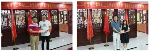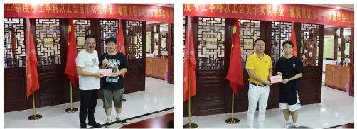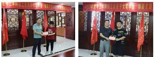 左图:姚柳波常务副会长为吴伟涛同学(右)发放奖学金
