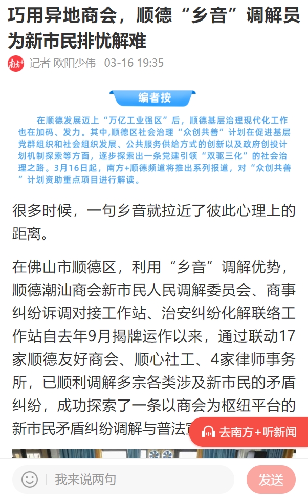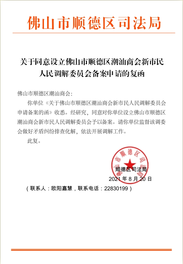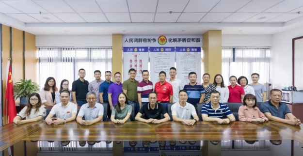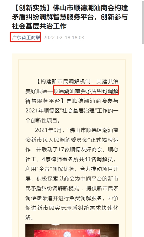 在佛山市顺德区委政法委、区司法局、区人民法院、区公安局、区民政人社局、区工商联以及区社创中心的共同指导下,2021年9月,<佛山市顺德区潮汕商会新市民人民调解委员会>正式揭牌运作,作为顺德区内首家异地商会调解试点单位,潮汕商会以“党建+人民调解”为主要抓手,建立一套新市民矛调联动工作机制,探索以商会为枢纽平台的新市民矛调新路径,坚持以防为主,调防结合,及时让矛盾纠纷化解在诉前,化解在基层,不仅节约了行政、司法资源,还有效预防和调处涉及新市民的各类矛盾纠纷。