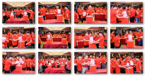 2022年,商会载誉前行,成绩属于每一位为商会奉献的企业家。会上,第二届理事会常务副会长兼党支部书记许宏生向获得“佛山市潮州商会2022年度优秀会员奖”称号的企业家颁发了奖牌和由王承忠会长出资赞助订制的纯金会徽。