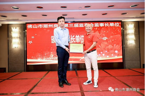 佛山市潮州商会第三届理事会会长王承忠先生为第三届理事会副会长单位颁发牌匾证书