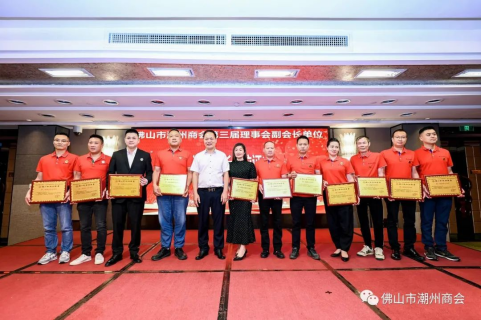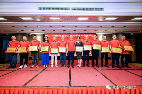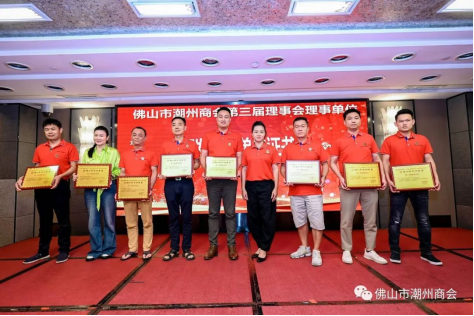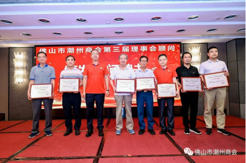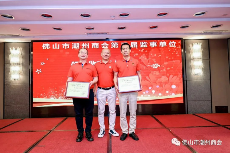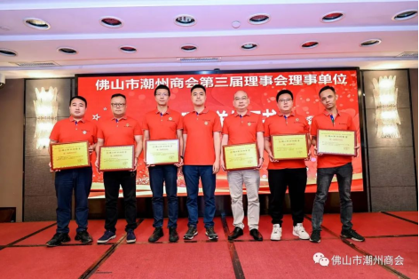 佛山市潮州商会第三届理事会执行会长陈霖先生、陈漫霞女士、李青先生为第三届理事会理事单位颁发证书