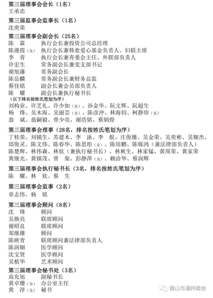 大会听取并审议通过了佛山市潮州商会《第二届理事会工作报告》《第二届监事会工作报告》《第二届理事会财务报告》《章程修改说明》等报告。并依法选举产生第三届理事会、监事会成员,王承忠当选佛山市潮州商会第三届理事会会长,沈奕荣当选监事长。