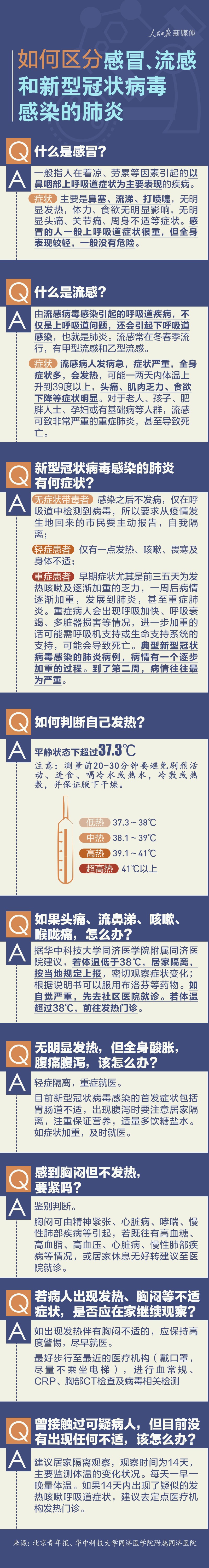 头痛、流鼻涕、咳嗽、喉咙痛怎么办?如何判断是否发热?如何区分感冒流感和新型冠状病毒感染的肺炎?一图了解↓↓↓