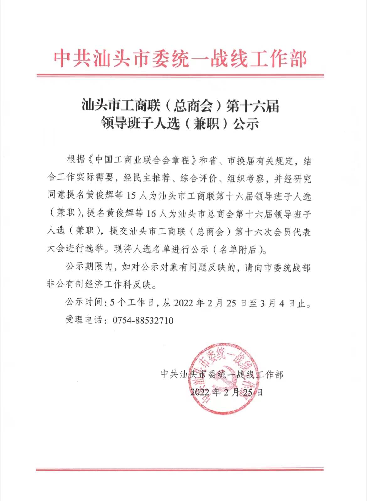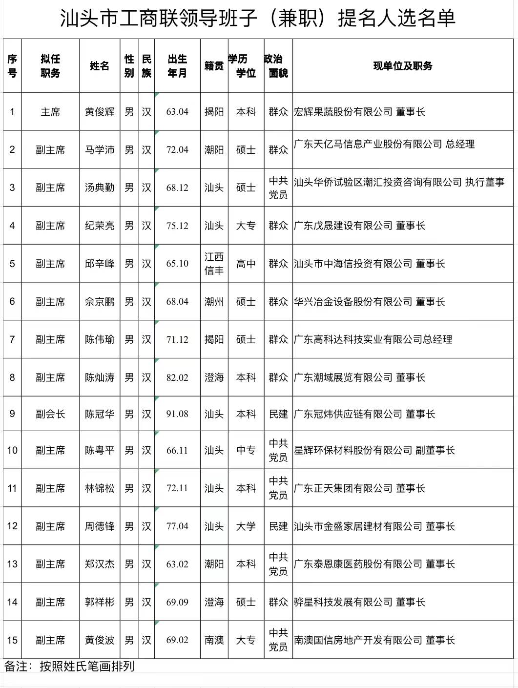 汕头市工商联(总商会)第十六届领导班子人选(兼职)公示