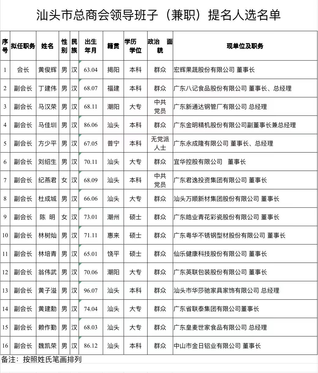汕头市工商联(总商会)第十六届领导班子增补人选...