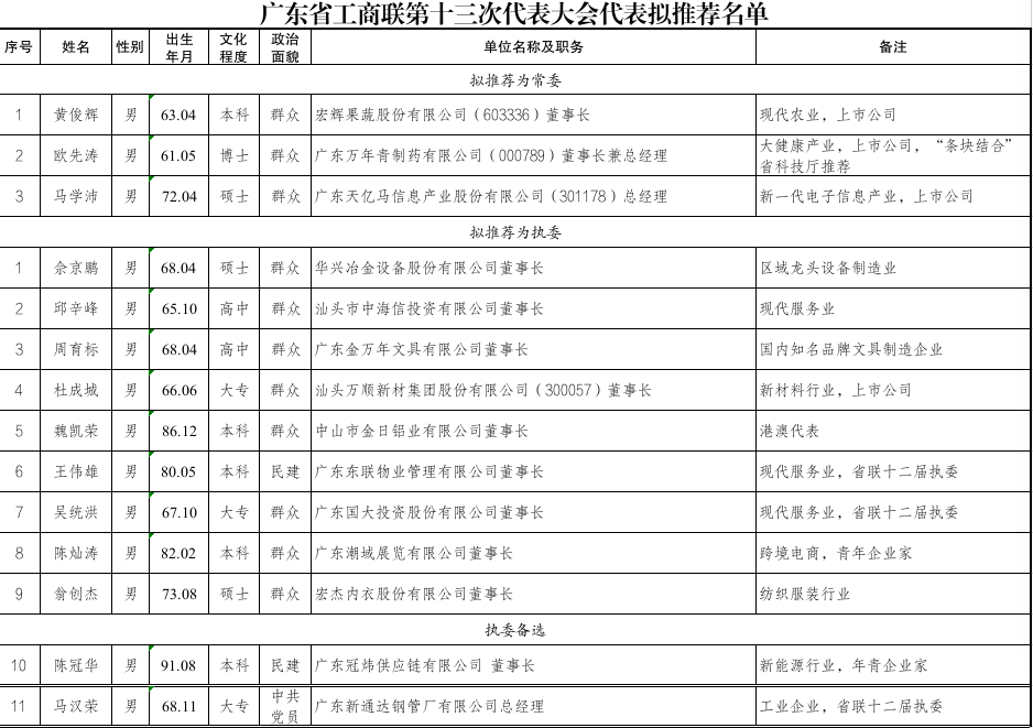 广东省工商联第十三次代表大会代表拟推荐名单公示