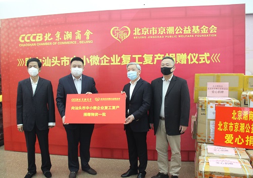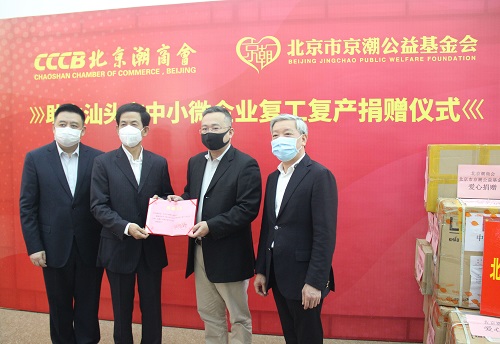 北京潮商会积极响应号召,在了解到汕头市部分中小微企业缺乏防疫物资情况后,积极筹集防疫物资并通过“助力复工复产专项”项目捐赠给汕头市中小微企业。3月9日上午,北京潮商会在会长单位广东阳柳集团举行“助力汕头市中小微企业复工复产捐赠仪式”,向我市中小微企业捐赠了口罩等一批抗疫物资,助力中小微企业复工复产。出席捐赠仪式的有市工商联主席黄茂强和主要负责领导,北京潮商会会长陈才雄、常务副会长周建轩等。
