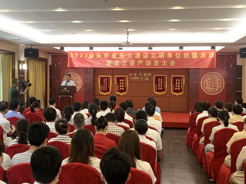 5月9日,2020年汕头市金乐大酒店文明单位创建活动暨复工复产动员大会在酒店举行。作为我市疫情期间留观服务定点酒店之一的金乐大酒店在圆满完成长达95天的接待疫情期间来汕隔离观察人员任务,重新投入营业。