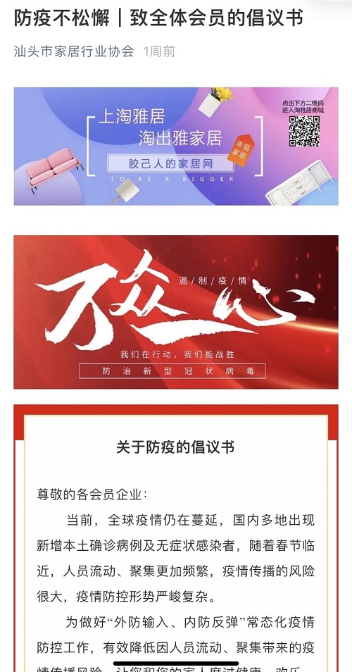 自倡议书发布以来,我市工商联系统各行业商协会,各地潮汕商会积极响应,迅速行动,纷纷向会员企业发出防控倡议书,共同构筑起抗击新冠肺炎疫情的坚固防线。