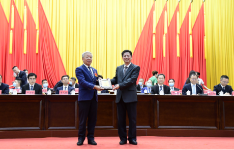 市委书记温湛滨为新当选的黄俊辉主席(会长)颁发牌匾。