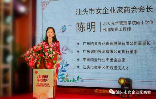 陈明会长表示,汕头女商历经二十余载,姐妹们商海创业战南北,运筹帷幄胜须眉,香肩敢挑千钧担,玉手揽月万山轻。女商会承前启后风雨路,砥砺前行写华章,已育繁花结硕果,更立壮志谱新篇。我们感恩这个伟大的时代,感恩商会这个温馨的家园,成长的摇篮。未来,女商会继续秉承“感恩谦逊、诚信正直、智慧卓越、爱心奉献”的核心价值,精诚团结,群策群力,携手融心,求真务实,在成就自我价值的同时实现社会价值。共商、共建、共享女商会大平台,因为在一起,才能了不起。我们女商心中有亲情,有友情,有家国情,有中华民族伟大复兴梦。心中有信仰,脚下有力量,让我们情牵女商,梦在中国。在实现梦想的道路上共同抒写时代新篇章。