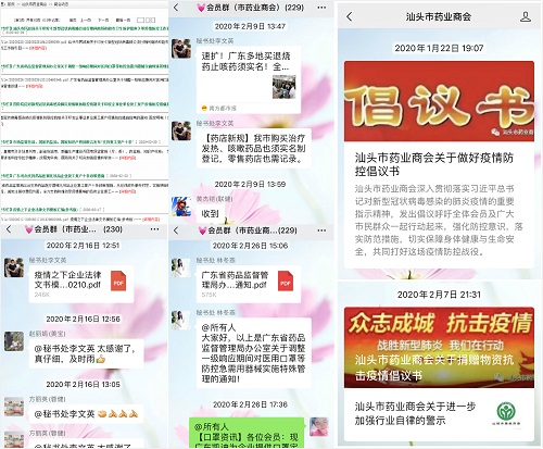 市药业商会通过网站、公众号、微信群第一时间向医药行业发出《自律倡议书》,指导会员企业严格按照有关法律法规和政策规范生产经营,积极配合政府相关部门维护疫情防控期间的市场秩序,坚决抵制和杜绝造假售假、以次充好、哄抬物价、囤积居奇等不法行为,树立企业良好形象。参加执法部门会议后,市药业商会又立即通过网站、公众号、微信群向全体会员发出《汕头市药业商会关于进一步加强行业自律的警示》,通报疫情发生以来市场监管部门对我市违法违规企业严格执法的情况,传达执法部门的工作部署和安排,号召企业引以为戒,遵纪守法,合规自律,知照执行。在市药业商会的引导下,会员们遵纪守法,自律规范,明码标价,诚信经营,不违法涨价,不哄抬价格,不囤积居奇,不价格欺诈,积极组织货源,保障我市防控医疗用品价格稳定和正常供应,共同维护生活平稳有序。
