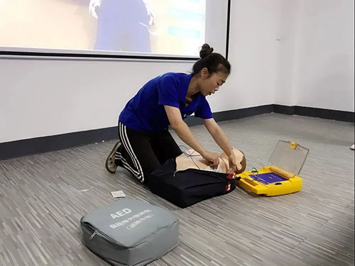 在理论知识讲述结束后,林玲副队长在现场为大家演示和讲解心肺复苏术、AED和“海姆立克”急救法的具体操作和注意事项,现场参与人员认真学习,受益匪浅。