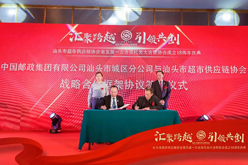 汕头市超市供应链协会与中国邮政集团有限公司汕头市城区分公司签署战略合作框架协议并授牌,双方将推动邮政业务服务地方经济社会发展,重点在金融服务、物流服务、电商平台及农村电商服务、惠农服务以及集邮刊类等方面深入开展合作。
