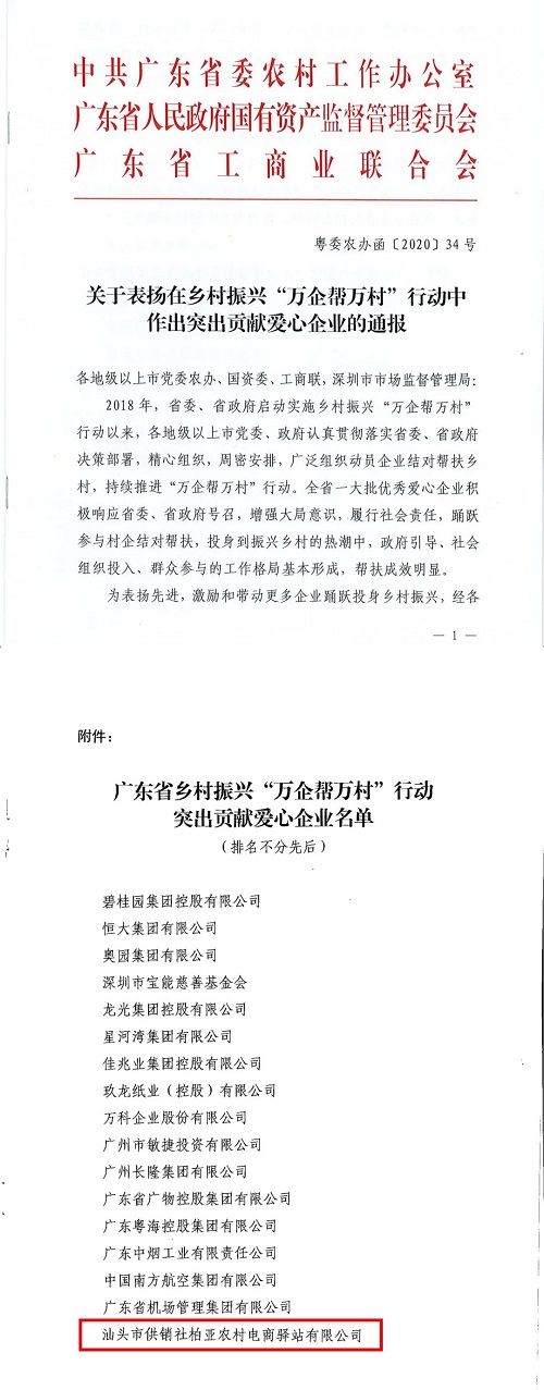 在通报中,汕头供销社柏亚农村电商驿站有限公司获评广东省乡村振兴“万企帮万村”行动突出贡献爱心企业。通报高度肯定了企业积极投身村企结对帮扶和乡村振兴,帮扶成效明显,凸显大局意识和责任担当。