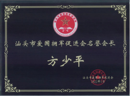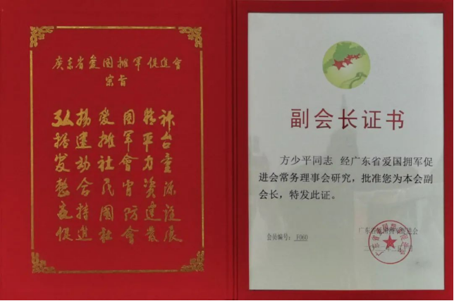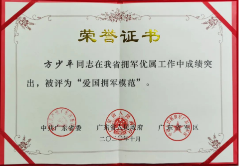 2020年,公司总经理方少平荣获《广东省爱国拥军模范》称号。