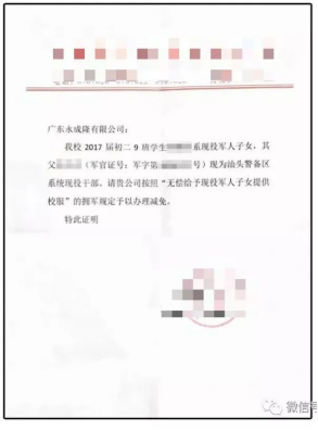 广东永成隆有限公司承诺:现役部队子女(入学新生)只要本公司有生产的校服,无论学校是否有与我司签订校服供应协议,由学校或部队出具证明文件,本公司均无偿给予提供校服。