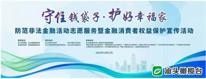 为切实提升社会公众金融风险防范意识和能力,保障金融消费者合法权益,12月27日下午,由市财政局、汕头金融监管分局等单位联合指导,多家金融行业组织携手承办,十家银行和保险机构共同参与的“2025年岁末年初防范非法金融活动志愿服务暨金融消费者权益保护宣传活动”在澄海区中骏世界城举行。本次活动以“守住钱袋子·护好幸福家”为主题,通过多元化的宣传形式,聚焦民生服务与风险防控,展现金融为民、惠民、利民的新风尚。活动现场吸引了大量市民踊跃参与。