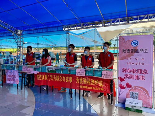 6月4日,顺德区潮汕商会积极响应,筹集采购500件清凉饮品(合计12000支)送至“大良德胜广场核酸检测点”,并连续两天在检测点设置“爱心饮用水自取点”,为奋战在一线的工作者以及前来核酸检测的群众免费派发爱心清凉饮品。