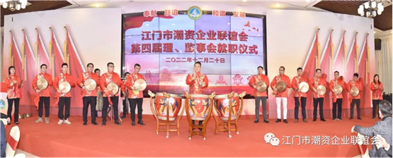 当晚,主题为“团结奋进 共创辉煌”的江门市潮资企业联谊会第四届理、监事会就职仪式在锣鼓喧天的潮州大锣鼓《欢庆》中拉开帷幕。江门市政协党组成员、秘书长、二级巡视员周文,中华全国工商业联合会执委、江门市工商联主席万国江出席仪式,向新当选的第四届理事会领导班子表示祝贺并颁发牌匾。