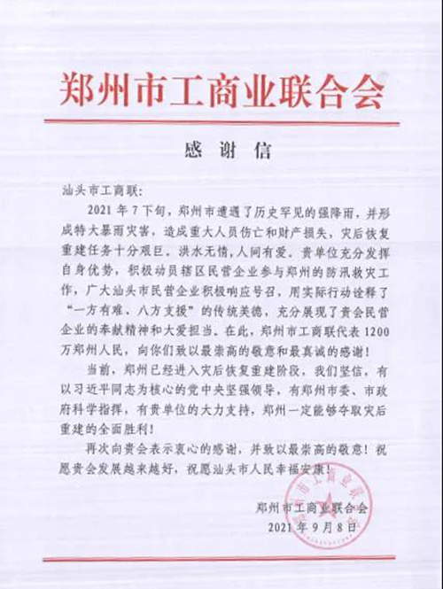 近期,郑州市工商联向汕头市工商联发来感谢信,对汕头市工商联及全市民营企业、爱心人士倾情奉献的爱心善举表示衷心感谢。