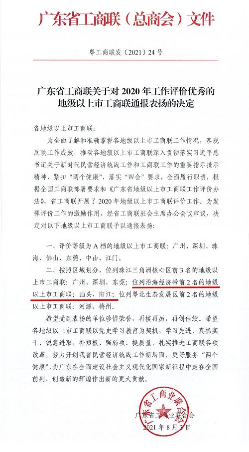 近日,广东省工商联对2020年工作评价优秀的地级以上市工商联进行通报表扬,汕头市工商联在2020地市工商联评价工作中位列沿海经济带地区第一名。